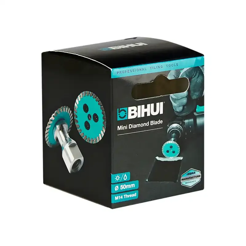 Profesjonalna tarcza diamentowa BIHUI o średnicy 50 mm z gwintem M14, idealna do precyzyjnego podcinania płytek ceramicznych, porcelany, marmuru i kamienia. Dzięki odsunięciu od szlifierki o 60 mm zapewnia większą kontrolę i wszechstronność podczas pracy.