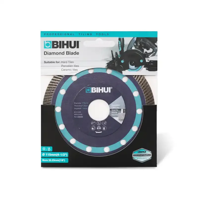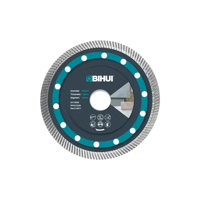 Precyzyjna tarcza diamentowa BIHUI Super Thin 115 mm. Zaprojektowana do suchego cięcia płytek ceramicznych, marmuru oraz kamienia, oferując ultra cienkie cięcia z minimalną ilością pyłu.