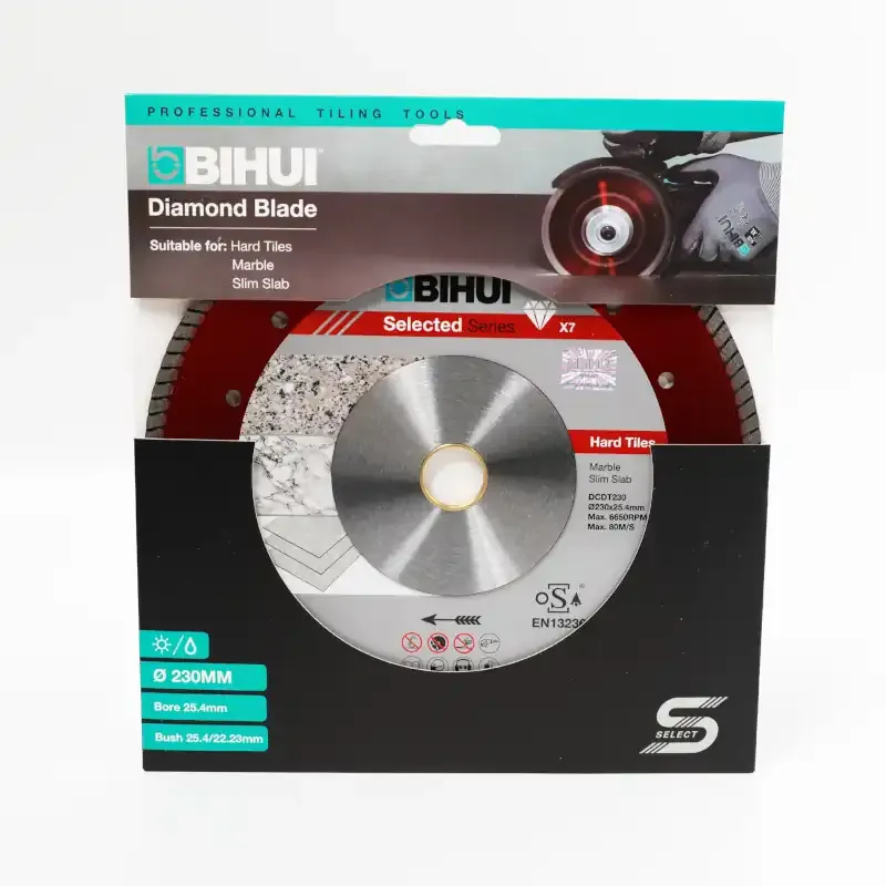 BIHUI Tarcza diamentowa B-Turbo 230 mm – precyzyjna tarcza do cięcia twardych płytek ceramicznych i porcelanowych. Cienka obręcz, wzmocniony otwór centralny i możliwość pracy na sucho i mokro sprawiają, że jest to idealny wybór dla profesjonalistów.