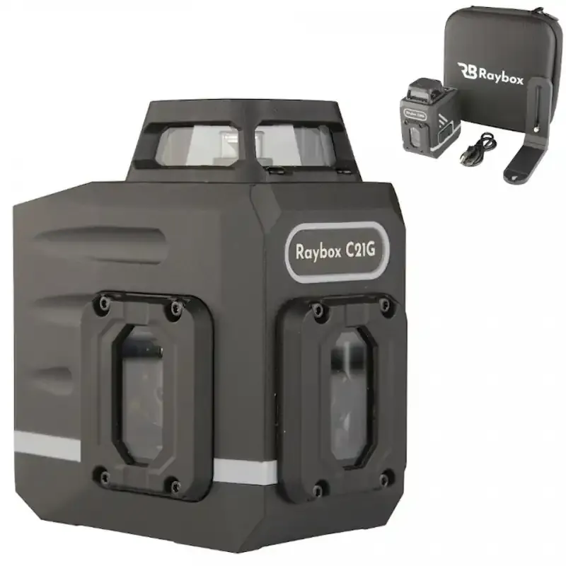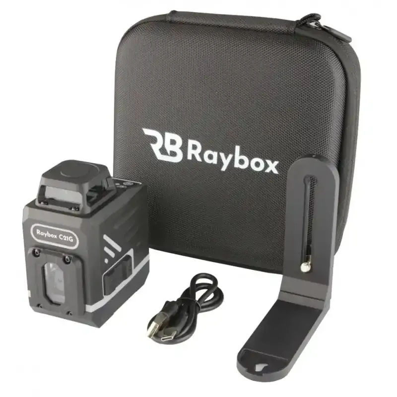 Raybox C21G to nowoczesne urządzenie laserowe, które precyzyjnie wyznacza poziomą płaszczyznę w pełnym zakresie 360º oraz dwie linie pionowe. Zaprojektowany z myślą o profesjonalistach w branży budowlanej i montażowej, ułatwia dokładne montowanie okien, szafek wiszących i innych elementów.