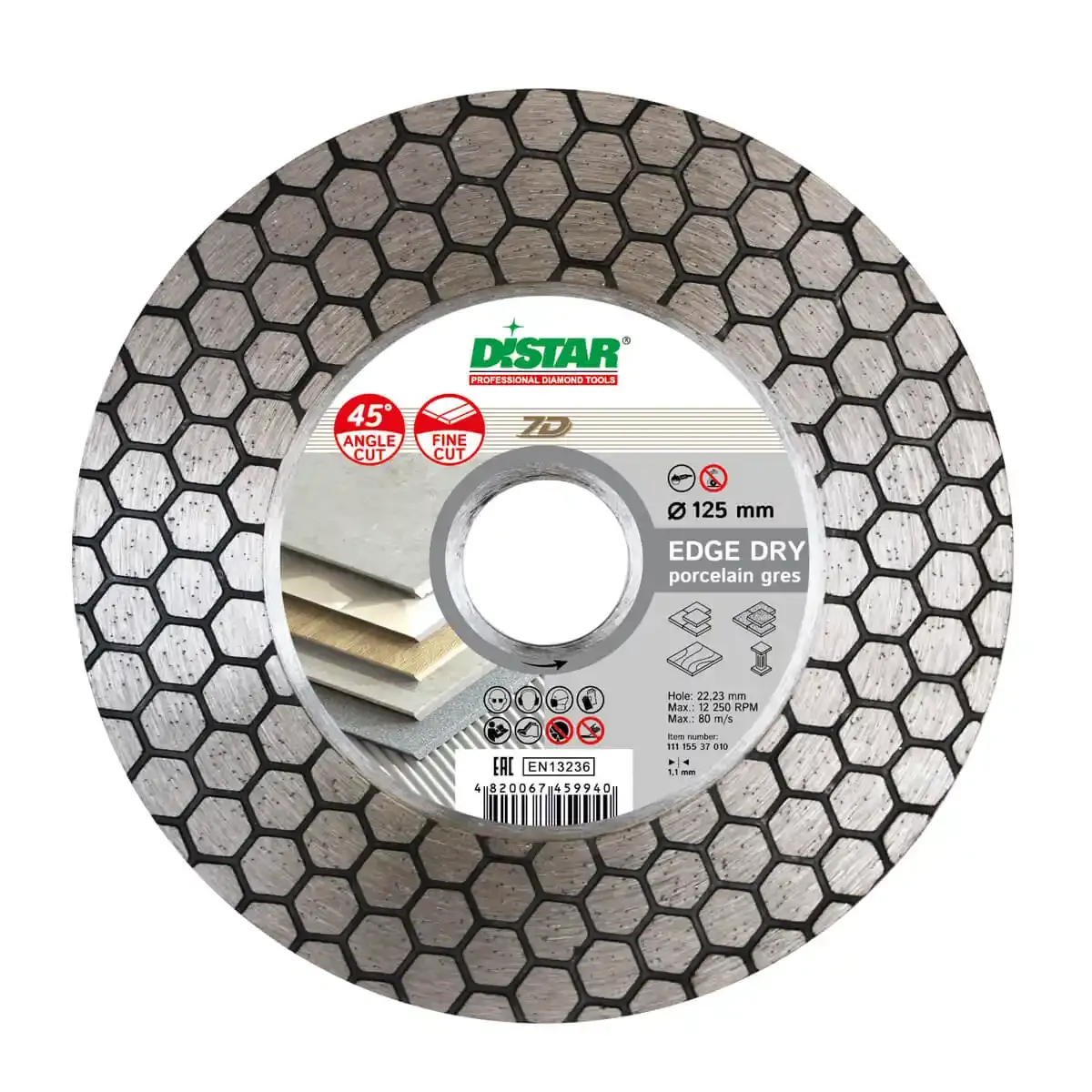Tarcza Distar Edge Dry o średnicy 125 mm, posiada szeroką dwustronną warstwę diamentową, która wzmacnia korpus tarczy, zapewniając miękkie i wydajne cięcie. Idealna do szlifowania krawędzi oraz bizotowania pod kątem 45°.