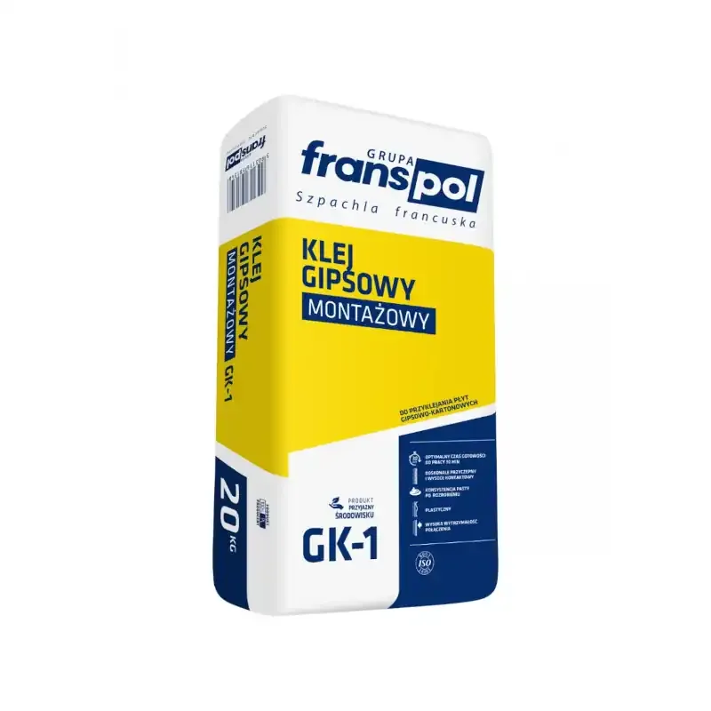 Klej Montażowy Gipsowy GK-1 to wysokiej jakości sucha mieszanka gipsowa, idealna do przyklejania płyt gipsowo-kartonowych wewnątrz pomieszczeń. Po wymieszaniu z wodą uzyskuje konsystencję pasty gotowej do użycia, którą należy wykorzystać w ciągu 30 minut. Produkt wyróżnia się doskonałą przyczepnością, łatwością aplikacji i wysoką wytrzymałością połączenia.