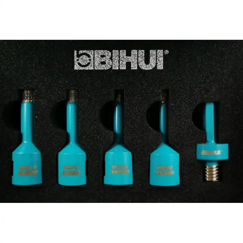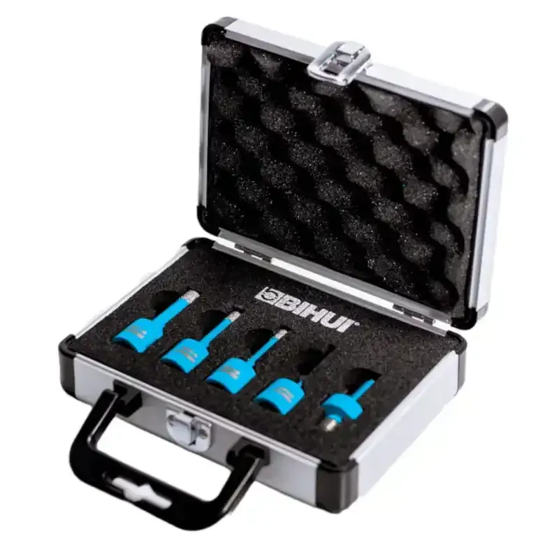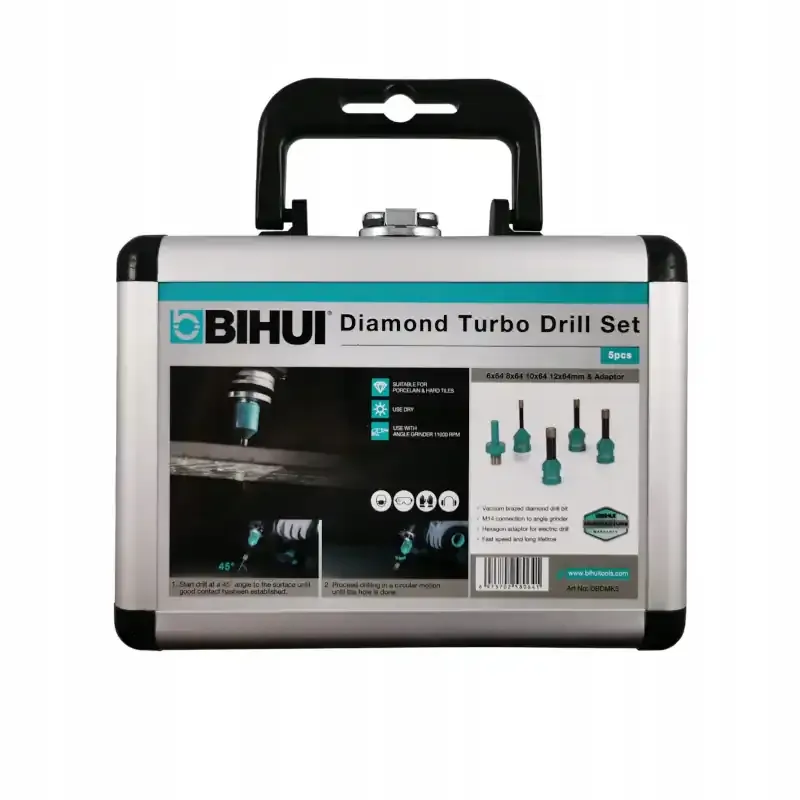Zestaw otwornic BIHUI BASIC MK5 o średnicach 6, 8, 10 i 12 mm z adapterem MK5 M14-HEX do wiertarki, zamknięty w praktycznej walizce. Otwornice diamentowe idealne do twardych materiałów, takich jak gres, beton i ceramika. Waga zestawu: 3 kg.