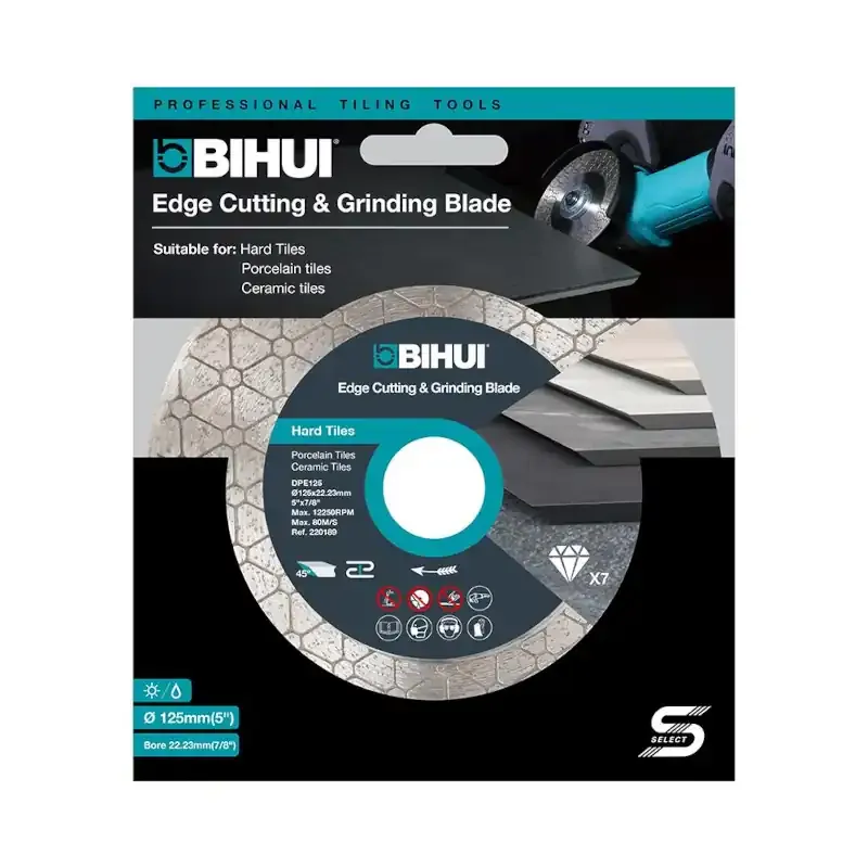 Tarcza diamentowa BIHUI DPE125 125 mm do cięcia i szlifowania twardych płytek, porcelanowych i ceramicznych. Umożliwia gładkie cięcie pod kątem 45° dzięki pełnej obręczy diamentowej o wysokości 25 mm. Idealna do szlifierek kątowych.