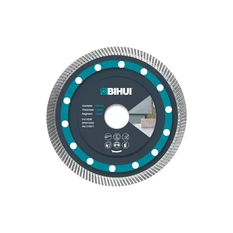 Profesjonalna tarcza diamentowa BIHUI Super Thin 125 mm, idealna do precyzyjnego cięcia twardych płytek ceramicznych, gresu, marmuru i granitu. Cienkie ostrze minimalizuje straty materiału i odpryski, gwarantując dokładne cięcie. Doskonały wybór do prac wykończeniowych.
