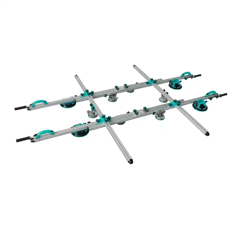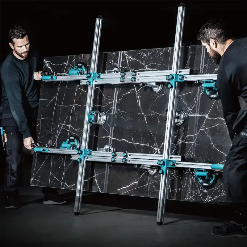 System BIHUI został stworzony z myślą o profesjonalistach zajmujących się układaniem dużych formatów płytek, kamienia i innych ciężkich elementów. Dzięki wytrzymałej konstrukcji, regulowanym szynom oraz zestawowi stabilnych przyssawek, narzędzie to zapewnia bezpieczny i wygodny transport płyt o wymiarach do 3,2 m x 1,6 m i wadze do 130 kg.