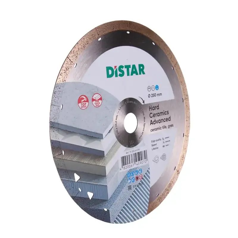 Diamentowa tarcza 1A1R 250 Hard Ceramics Advanced – profesjonalna tarcza do szybkiego i precyzyjnego cięcia ceramiki, gresu oraz Dektonu. Wyposażona w ciągły segment diamentowy z domieszką grafitowych chipsów, zapewnia doskonałą jakość cięcia przy zastosowaniu chłodzenia wodą.