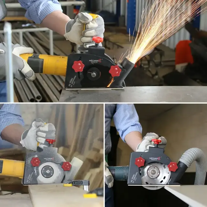 Osłona do cięcia Mechanic AirSLIDER 90° 115-125 mm przekształca szlifierkę kątową w precyzyjne narzędzie do cięcia pod kątem prostym, zapewniając kontrolowane i bezpieczne cięcie różnych materiałów.