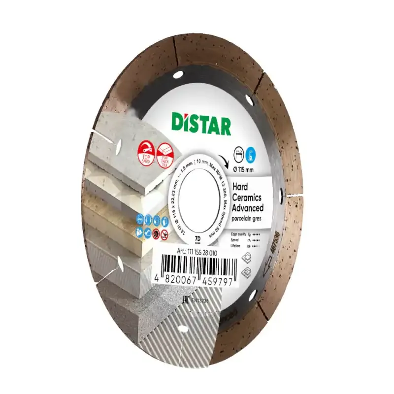 Tarcza diamentowa Distar Hard Ceramics Advanced o średnicy 115 mm to profesjonalne narzędzie do cięcia ceramiki i gresu. Dzięki ciągłemu segmentowi diamentowemu i dodatkom grafitowym zapewnia najwyższą jakość cięcia oraz długą żywotność. Przeznaczona do pracy z chłodzeniem wodnym.