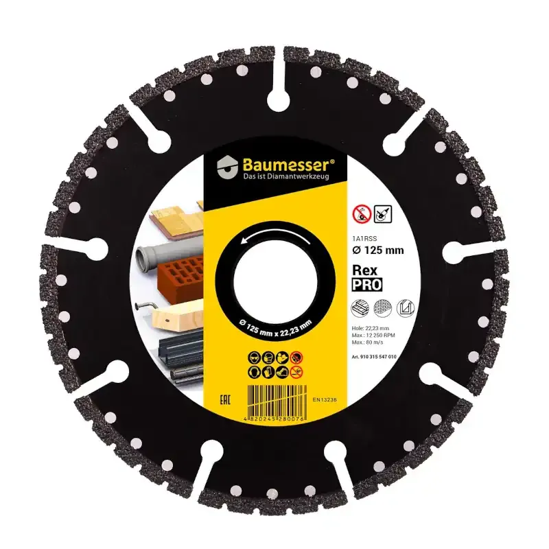 Tarcza diamentowa Baumesser PRO Rex 125 mm – uniwersalna do cięcia cegły, betonu, stali, drewna, plastiku i metalu. Technologia spiekania próżniowego.