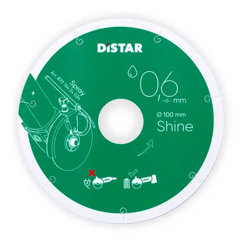 Marzenie każdego glazurnika stało się rzeczywistością! Tarcza Distar Shine o ultracienkiej warstwie diamentowej 0,6 mm umożliwia precyzyjne cięcie gresu porcelanowego i ceramiki, pozostawiając idealnie gładką krawędź bez potrzeby dodatkowego szlifowania.