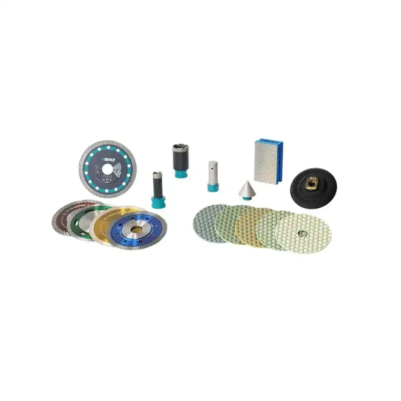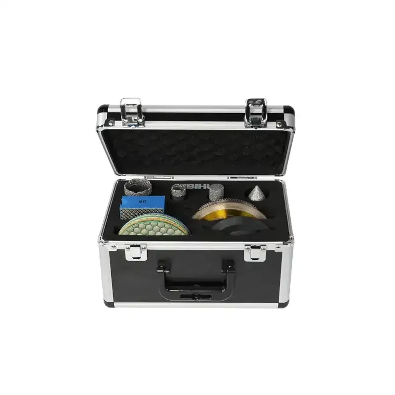 Profesjonalny zestaw narzędzi diamentowych BIHUI (16 szt.) w poręcznej walizce – zawiera koronki, frezy, tarcze tnące, krążki szlifierskie i uchwyt z rzepem. Kompletny pakiet do cięcia, szlifowania i polerowania płytek oraz kamienia.