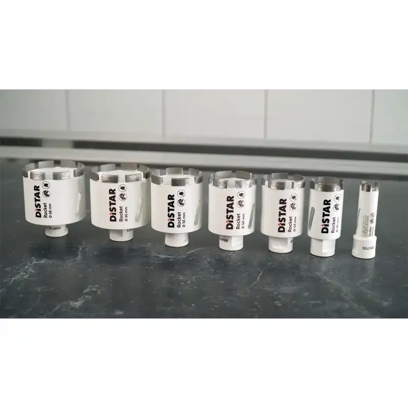 Wiertło diamentowe Distar DDS-W 20x45-3xM14 Rocket to wysokowydajne narzędzie do suchego wiercenia w gresie i granicie. Dzięki spiekanym segmentom diamentowym i solidnej konstrukcji zapewnia ponad 300 otworów w gresie o grubości 10 mm, bez potrzeby chłodzenia wodą.