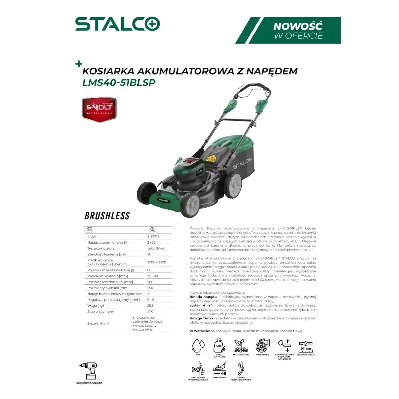 Kosiarka akumulatorowa LMS40-51BLSP marki STALCO to wydajne urządzenie do koszenia średnich i dużych trawników. Szerokość koszenia wynosi 51 cm, a system 4 w 1 (mulczowanie, zbieranie do kosza, wyrzut tylny i boczny) zapewnia wszechstronność. Wyposażona w napęd z regulacją prędkości i funkcję Turbo, idealnie nadaje się do trudniejszych zadań.