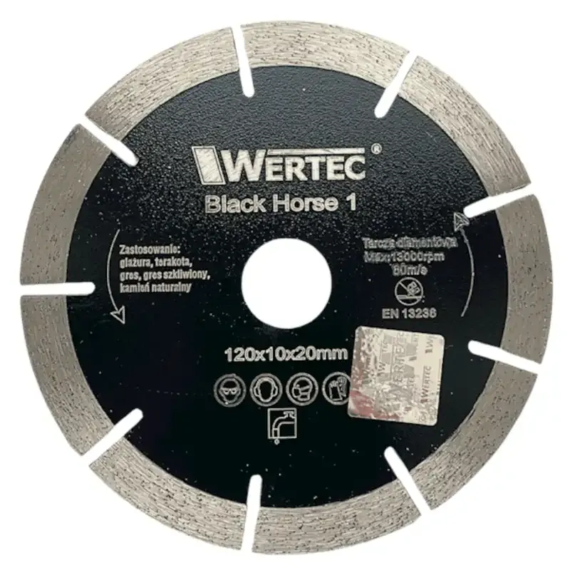Tarcza diamentowa Black Horse 1 120 × 20 mm – profesjonalna tarcza klasy PREMIUM, segment 10 mm, niska gradacja nasypu diamentowego. Do cięcia na mokro glazury, gresu, terakoty i kamienia. Pasuje do przecinarek wodnych WERTEC serii WTPDG.
