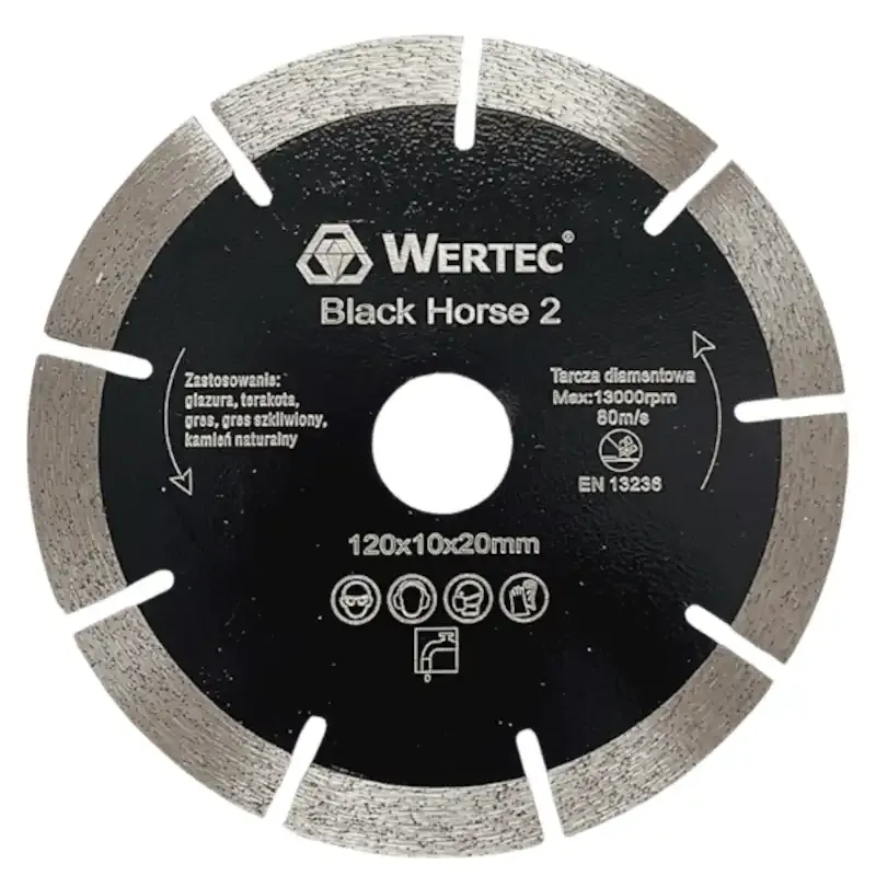 Tarcza diamentowa BlackHorse 2 120 × 20 mm – klasa PREMIUM, segment 10 mm, do cięcia na mokro glazury, gresu, terakoty i kamienia. Precyzyjne i wydajne narzędzie dla profesjonalistów.