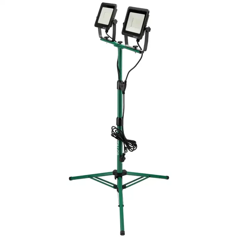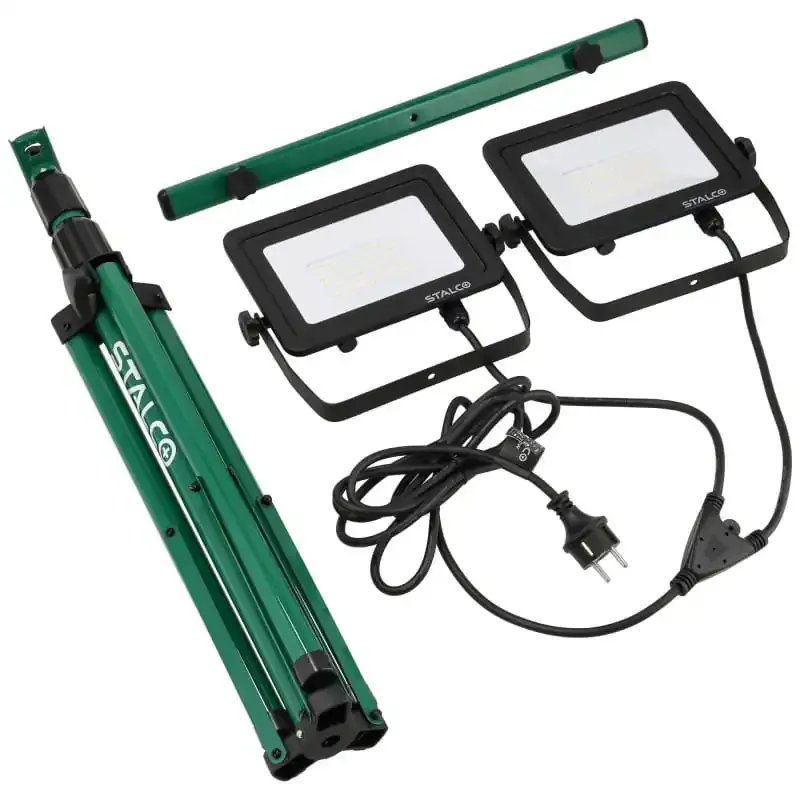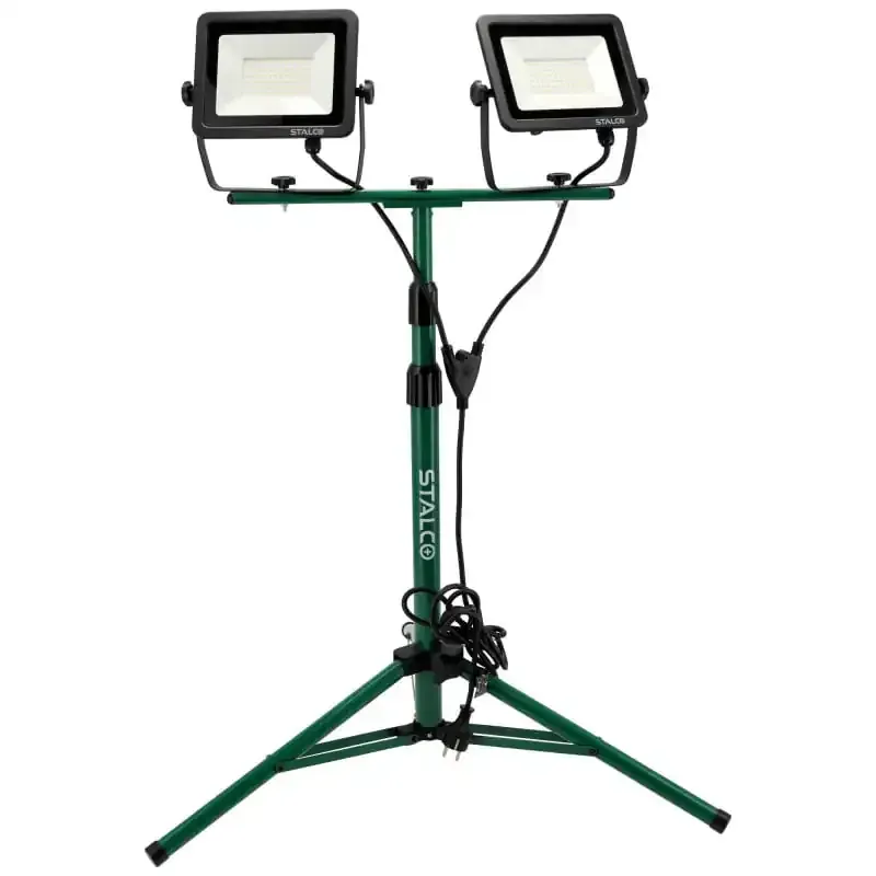 Reflektor Budowlany Stalco 2x50W FL o łącznej mocy 100W, strumieniu świetlnym 9000 lm i stopniu ochrony IP65. Wyposażony w regulowany statyw (60–180 cm), kąt świecenia 120° i żywotność diod LED wynoszącą 30 000 godzin. Idealny do zastosowań budowlanych i domowych.