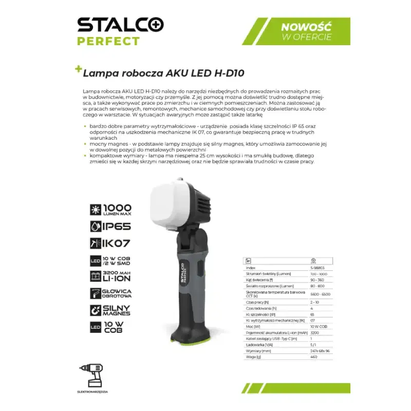 Lampa Robocza Aku LED H-D10 Stalco Perfect z regulacją strumienia światła do 500 lm, akumulatorem o pojemności 3200 mAh i klasą ochrony IP65. Kompaktowe wymiary i czas pracy do 18 godzin czynią ją idealnym narzędziem do zadań w trudnych warunkach.