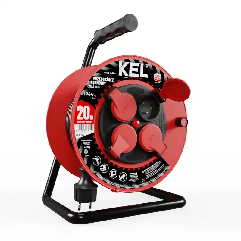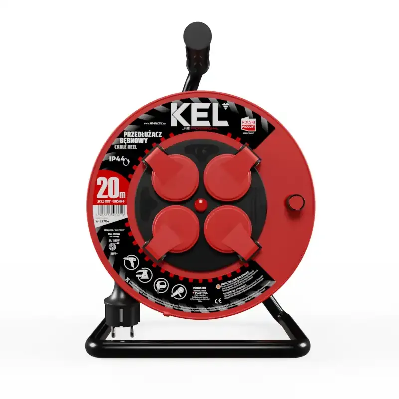 Przedłużacz bębnowy warsztatowy PROFESSIONAL LINE o długości 20 m z przewodem 3×1,5 mm². Wyposażony w 4 gniazda 2P+Z, zapewnia wydajność i niezawodność przy maksymalnym obciążeniu 16A/3680W. Idealny do zastosowań warsztatowych i domowych.