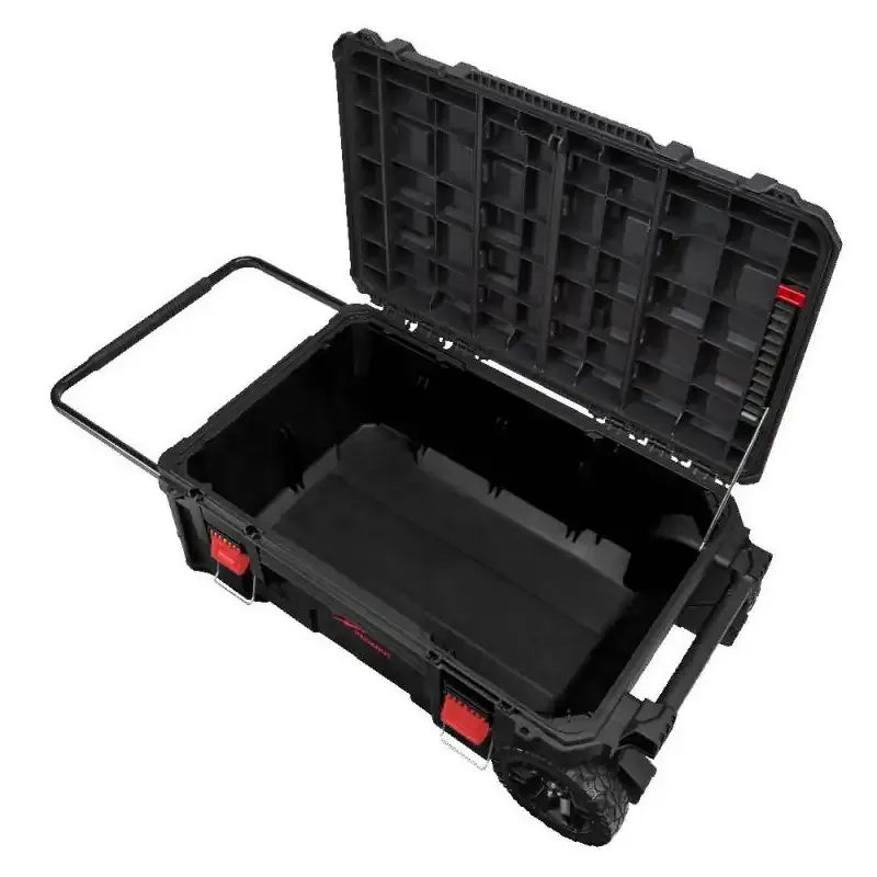 Skrzynia PACKOUT™ na kołach Milwaukee to niezawodne rozwiązanie do transportu i przechowywania narzędzi w trudnych warunkach pracy. Dzięki modułowej konstrukcji jest kompatybilna z innymi elementami systemu PACKOUT™, co pozwala na łatwe dopasowanie do indywidualnych potrzeb użytkownika. Wysoka ładowność, wytrzymała konstrukcja i duże koła zapewniają wygodę użytkowania nawet na nierównym terenie.