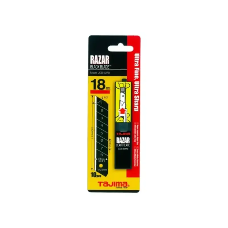 Profesjonalne ostrza segmentowe łamane 18 mm Tajima "Razar Black", wykonane z wysokogatunkowej stali. Precyzyjnie ostrzone krawędzie tnące zapewniają skuteczność cięcia papieru, kartonu, tworzyw i materiałów. Opakowanie 10 sztuk w magazynku z tworzywa.