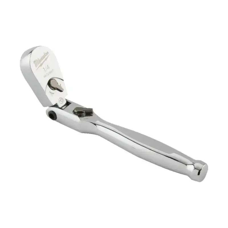 Grzechotka 1/4" Milwaukee z przegubową główką i mechanizmem 90 zębów, umożliwiająca pracę w trudno dostępnych miejscach dzięki ruchomej konstrukcji głowicy.