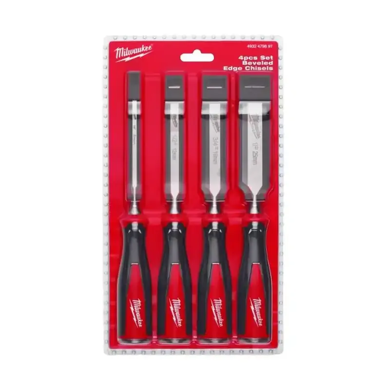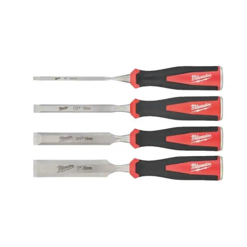 Zestaw dłut Milwaukee o sfazowanej krawędzi, przeznaczonych do precyzyjnej obróbki drewna i innych materiałów. W zestawie dłuta o rozmiarach 6, 12, 19 i 25 mm.