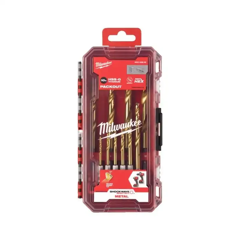 Wysokiej jakości zestaw 10 wierteł udarowych Milwaukee Shockwave HSS-G TiN Red Hex, o zakresie 3–10 mm. Powłoka tytanowa zapewnia wytrzymałość i efektywne wiercenie w metalu.