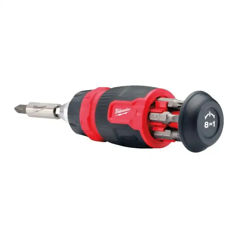 Kompaktowy multi-wkrętak Milwaukee z grzechotką 8 w 1. Wszechstronne narzędzie z wymiennymi końcówkami, idealne do precyzyjnych prac śrubowych.