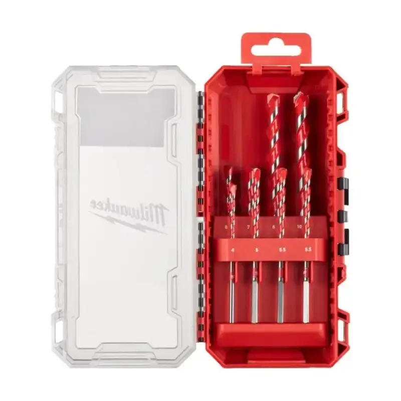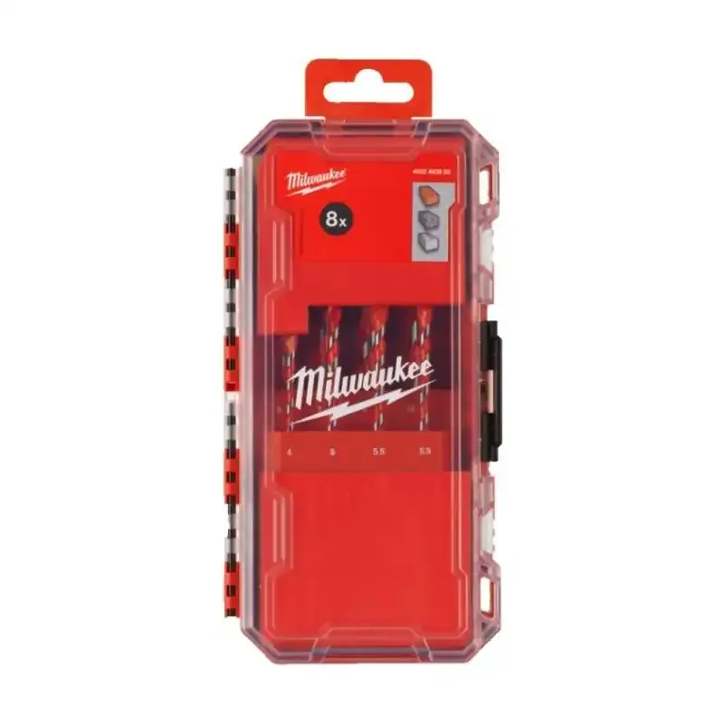 Zestaw 8 wierteł udarowych Premium Milwaukee do betonu z uchwytem cylindrycznym (4–10 mm). Doskonałe do precyzyjnego wiercenia w twardych materiałach.