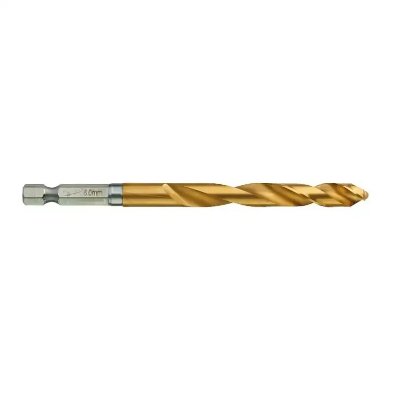 Wiertła Milwaukee Shockwave HSS-G Tin 8 mm z powłoką z azotku tytanu. Idealne do wiercenia w metalu przy dużych prędkościach. Uchwyt Hex 1/4". Opakowanie: 5 szt.