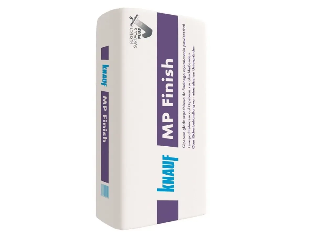 Gładź szpachlowa KNAUF MP finish to sucha masa do przygotowywania gładkich i jednorodnych powierzchni ścian i sufitów przed malowaniem lub tapetowaniem. Produkt stosuje się do wyrównywania drobnych nierówności, pęknięć oraz łączeń płyt gipsowych, tworząc gładką i odporną na obciążenia powłokę. Dzięki dobrej przyczepności i odpowiedniej plastyczności masa ułatwia aplikację i szlifowanie, co przyspiesza prace wykończeniowe w mieszkaniach i obiektach użytkowych.