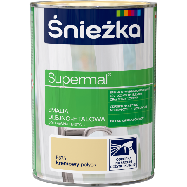 Emalia olejno‑ftalowa ŚNIEŻKA SUPERMAL w kolorze kremowy połysk przeznaczona jest do malowania powierzchni wewnętrznych i zewnętrznych. Produkt dobrze przywiera do drewna, metalu oraz wcześniej malowanych powierzchni. Tworzy trwałą, odporną na ścieranie i warunki atmosferyczne powłokę. Farba łatwo się aplikuje pędzlem, wałkiem lub natryskiem, szybko schnie i zapewnia jednolite, estetyczne wykończenie z połyskiem.