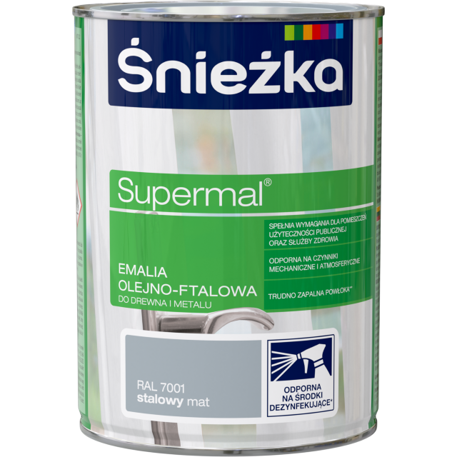 Emalia olejno‑ftalowa ŚNIEŻKA SUPERMAL w kolorze stalowy mat przeznaczona jest do malowania powierzchni wewnętrznych i zewnętrznych. Produkt dobrze przywiera do drewna, metalu oraz wcześniej malowanych powierzchni. Tworzy trwałą, odporną na ścieranie i działanie czynników atmosferycznych powłokę. Farba jest łatwa w aplikacji pędzlem, wałkiem lub natryskiem, szybko schnie i zapewnia jednolite, estetyczne matowe wykończenie.