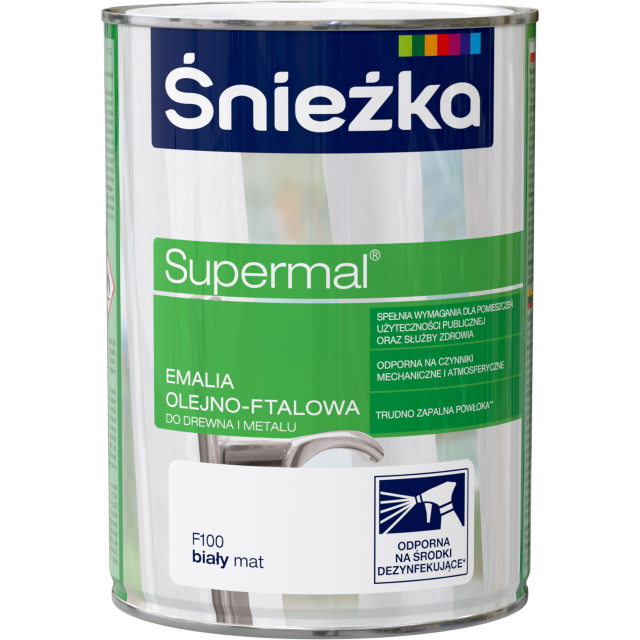 SUPERMAL Emalia olejno-ftalowa stosowana jest do dekoracyjno-ochronnego malowania drewna, materiałów drewnopochodnych, tynków oraz elementów stalowych i żeliwnych użytkowanych wewnątrz i na zewnątrz pomieszczeń, takich jak: okna, drzwi, meble, ogrodzenia, lamperie itp. Polecana do stosowania w pomieszczeniach mieszkalnych, przeznaczonych na stały pobyt chorych w budynkach służby zdrowia oraz przeznaczonych na stały pobyt dzieci i młodzieży w budynkach oświaty, a także w pomieszczeniach przeznaczonych do przechowywania produktów żywnościowych (bez bezpośredniego kontaktu z żywnością).