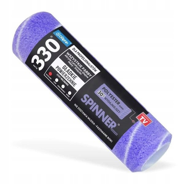 Blue Dolphin wałek SPINNER Serii 330 to wałek malarski wykonany z innowacyjnego materiału, polyester blend, który lepiej chłonie i oddaje farbę, a przy tym nie zostawia włosia. Jego zaletą jest też nieskomplikowane mocowanie. Nawet przy wielokrotnym użyciu zachowuje swoją pierwotną puszystość. Dzięki zastosowaniu skosów na końcach wałka, wyeliminowane jest nawarstwianie się farby na krawędziach.