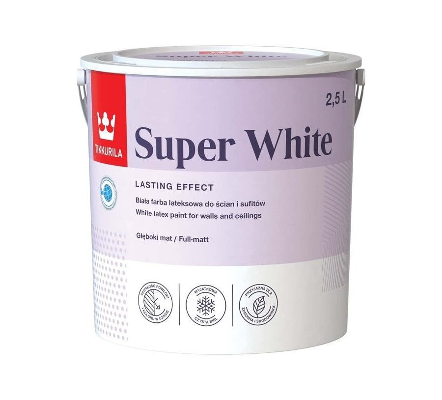 Tikkurila Super White 2,5 l to wysokiej jakości farba lateksowa przeznaczona do malowania ścian i sufitów wewnątrz pomieszczeń. Produkt zapewnia intensywną, czystą biel, która skutecznie rozjaśnia wnętrza i nadaje im świeży, estetyczny wygląd. Farba sprawdza się w salonach, sypialniach, biurach, korytarzach oraz innych pomieszczeniach mieszkalnych i użytkowych. Dobrze kryjąca formuła ułatwia uzyskanie jednolitej powierzchni bez smug i prześwitów. Niska emisja zapachu zwiększa komfort pracy i pozwala szybko wrócić do użytkowania pomieszczeń. Opakowanie 2,5 litra sprawdzi się podczas standardowych prac remontowych i wykończeniowych.