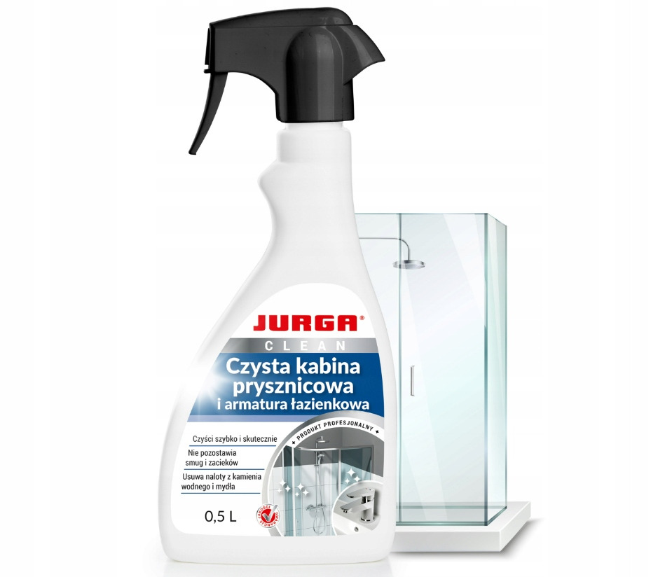 Jurga Czysta Kabina Prysznicowa i Armatura Łazienkowa to gotowy do użycia preparat do mycia i czyszczenia kabin prysznicowych oraz armatury łazienkowej, takie jak krany, baterie prysznicowe i wannowe.