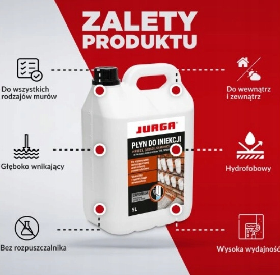 JURGA PŁYN DO INIEKCJI - to profesjonalny produkt dzięki któremu zabezpieczysz ściany swojego domu jego piwnicę, garaż czy inny budynek przed działaniem wilgoci.
