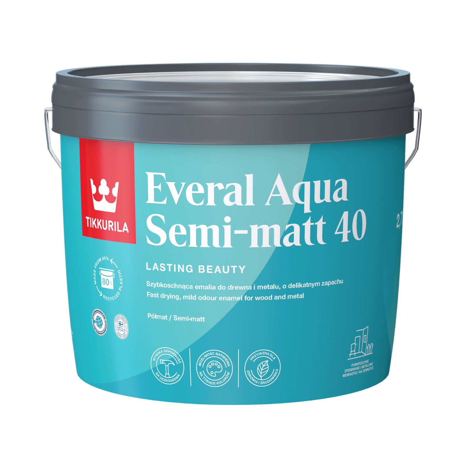 Farba Tikkurila Everal Aqua 40 Baza A 9 l to nowoczesna wodorozcieńczalna emalia akrylowa do drewna, metalu i przygotowanych podłoży, stworzona do zastosowań zarówno wewnętrznych, jak i zewnętrznych. Produkt tworzy powłokę o półmatowym wykończeniu, która dobrze kryje i równomiernie się rozprowadza. Dzięki nowoczesnej recepturze farba zapewnia odporność na uszkodzenia mechaniczne, promieniowanie UV oraz zmywanie detergentami, a powłoka nie zmienia barwy (nie żółknie) z czasem. Produkt ma neutralny zapach podczas nakładania i może być barwiony w szerokiej gamie kolorów systemów Tikkurila.