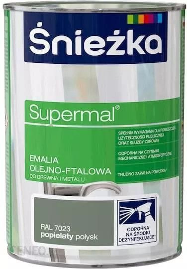 Emalia olejno-ftalowa Śnieżka SUPERMAL w kolorze popielatym z połyskiem to uniwersalna farba dekoracyjno-ochronna, przeznaczona do malowania elementów drewnianych, drewnopochodnych, metalu oraz tynków na zewnątrz i wewnątrz pomieszczeń. Produkt tworzy trwałą, gładką powłokę o estetycznym połysku, która wyróżnia się dobrą przyczepnością do podłoża i odpornością na warunki atmosferyczne. Emalia sprawdza się przy odnawianiu okien, drzwi, ogrodzeń czy mebli — jest łatwa w aplikacji pędzlem, wałkiem lub natryskiem i zapewnia dekoracyjne wykończenie powierzchni.