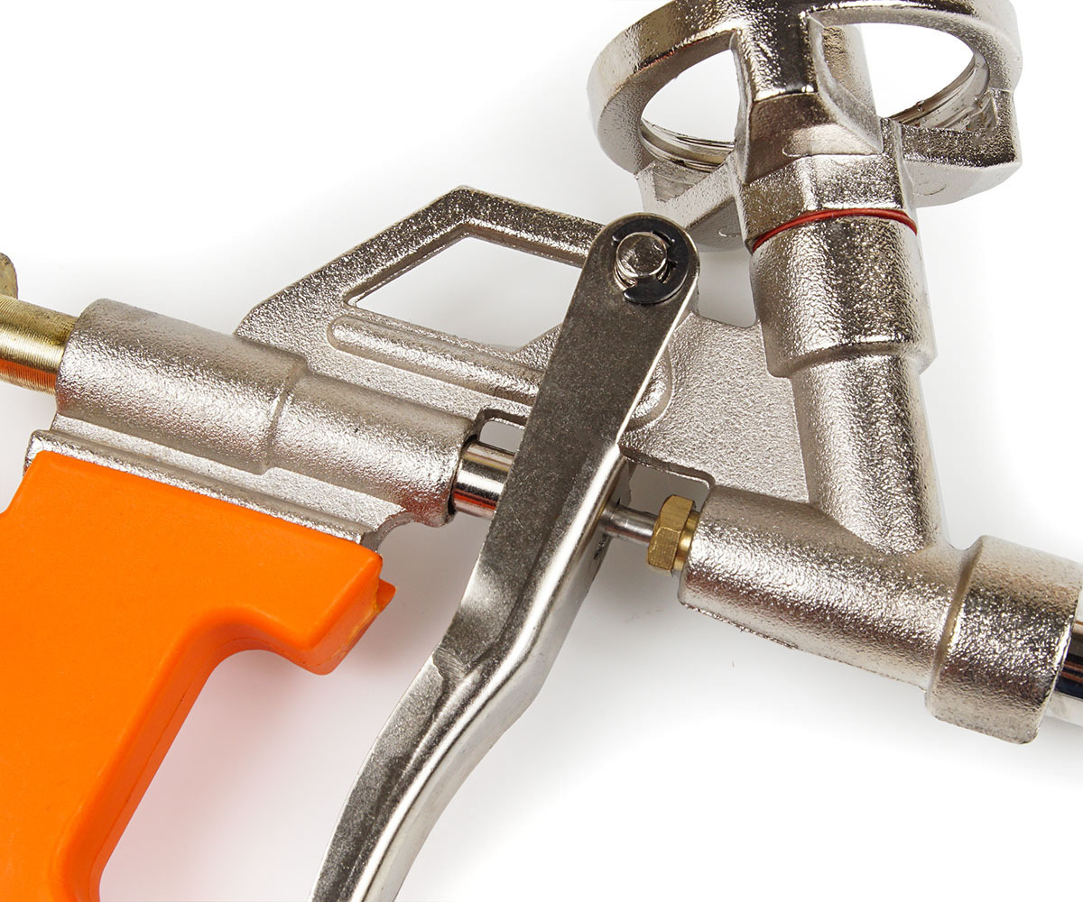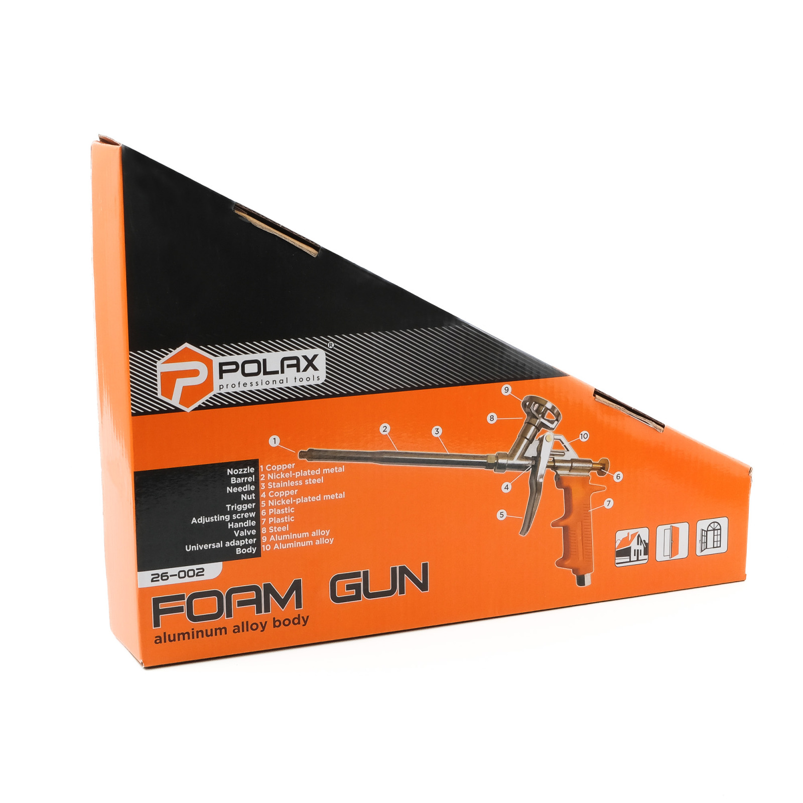 Pistolet do piany Polax to niedrogie i wysokiej jakości narzędzie służące do bardziej precyzyjnego nakładania pianki na powierzchnie konstrukcyjne w celu uszczelniania szwów i złączy o szerokości 2 cm. Pistolet służy do pracy z pianką poliuretanową w cylindrach przystosowanych do dysza pistoletu. Wydłużony i częściowo zwężający się metalowy cylinder ułatwia nakładanie piany w trudno dostępnych miejscach i zwiększa ciśnienie wylotu piany. Śruba regulacyjna, nakrętka dystansowa i dysza pistoletu wykonane są ze stopu miedzi, co pozwala wydłużyć żywotność pistoletu. Zawór iglicowy wykonany jest z mosiądzu, co ogranicza powstawanie piany i ułatwia czyszczenie pistoletu. Całkowitą szczelność obudowy zapewnia również zawór zwrotny w adapterze, który wykonany jest z materiału PTTF, co pozwala na pozostawienie podłączonego pojemnika z pianką po jego użyciu i daje gwarancję, że pianka nie wyschnie wyjść w ciągu 30 dni. Jednolity kierunkowy dopływ pianki wraz z wytrzymałą i ergonomiczną rączką z tworzywa sztucznego przyczynia się do dokładniejszego i wygodniejszego wykonywania powierzonych zadań. W zestawie znajdują się 4 dysze.