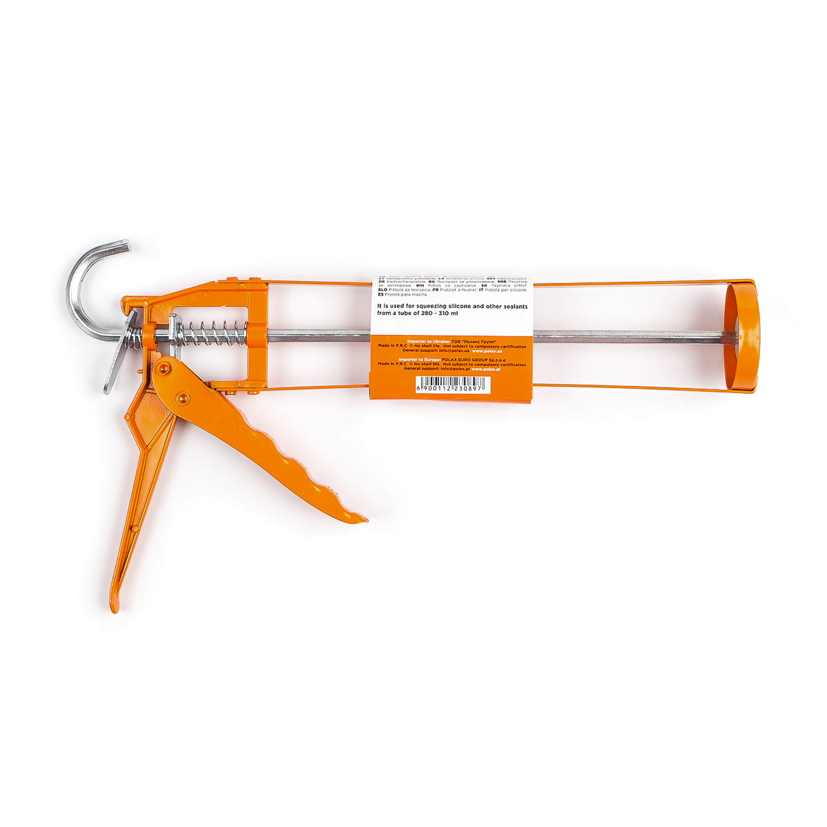 Ramowy pistolet uszczelniający Polax 225 mm przeznaczony jest do dozowanego nakładania zapraw i klejów na powierzchnie. Pistolet wykonany jest ze stali wysokowęglowej i malowany proszkowo, co zapewnia wysokie właściwości antykorozyjne. Charakteryzuje się niską wagą i ergonomiczną konstrukcją. Świetne do użytku domowego.