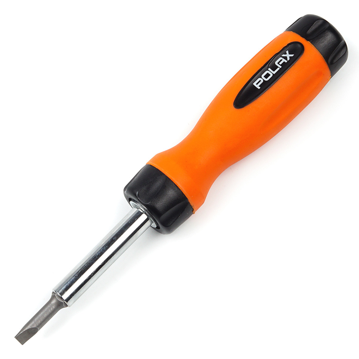 Wkrętak nastawny Polax z wymiennymi końcówkami 4 w 1 (40-001) to niezawodne narzędzie do wykonywania różnego rodzaju prac. Część robocza wykonana jest ze stali Cr-V, co zapewnia doskonałą wytrzymałość i długą żywotność wkrętarki. Możesz być pewien, że będzie Ci służyć przez wiele lat. Wygodny i ergonomiczny uchwyt zapewnia pewny chwyt i wygodę podczas użytkowania. Zapobiega także poślizgowi, dzięki czemu praca jest bezpieczniejsza i wydajniejsza. W tym zestawie znajdziesz 2 bity dwustronne o różnych rozmiarach - PH1/SL5 i PH2/SL6. Oznacza to, że możesz łatwo przełączać się między różnymi typami śrub, bez konieczności szukania dodatkowych narzędzi. Wkrętarka wyposażona jest w wyjmowany uchwyt na bity o długości 113 mm, który zapewnia wygodę podczas wymiany bitów. Możesz także przechowywać zapasowe bity w uchwycie na bity, aby zapewnić łatwy dostęp. Długość bitu PH1/SL5 wynosi 65 mm, a długość bitu PH2/SL6 wynosi 75 mm. Te rozmiary pasują do większości typów śrub, dzięki czemu wkrętak Polax jest idealnym wyborem do różnych zastosowań. Dzięki całkowitej długości 165 mm i długości roboczej 45 mm ten wkrętak jest wygodny w użyciu w ograniczonych przestrzeniach i zapewnia doskonały chwyt śrub. Wkrętak nastawny Polax z wymiennymi końcówkami 4 w 1 (40-001) to niezawodne narzędzie o wygodnych właściwościach, które stanie się niezastąpionym pomocnikiem w pracach naprawczych i budowlanych. Nie przegap okazji, aby ułatwić sobie życie dzięki temu wszechstronnemu narzędziu.