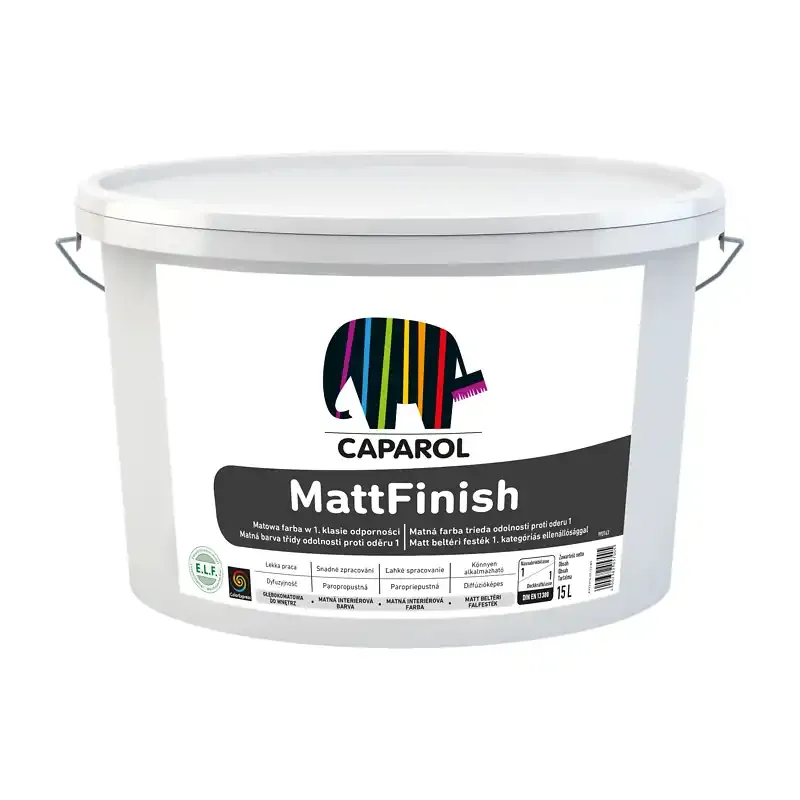 MattFinish – głęboko matowa farba wewnętrzna o wysokiej odporności na szorowanie (klasa R1 wg PN-EN 13300). Idealna do pomieszczeń o dużym obciążeniu, takich jak biura czy hotele. Przyjazna dla środowiska, wodorozcieńczalna, dostępna w białym kolorze lub w odcieniach barwionych w systemie ColorExpress.