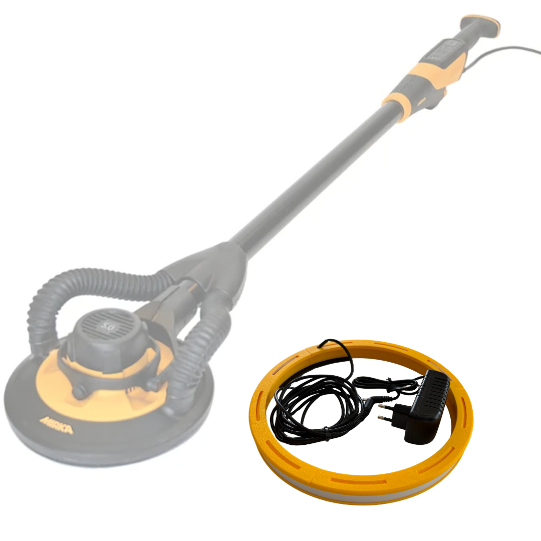 ZACHOWANA ERGONOMIA MISTRZA: Cała konstrukcja waży zaledwie 200 gramów! Wykonana z lekkiego i wytrzymałego tworzywa, nakładka Led-ON została zaprojektowana tak, by nie zaburzać legendarnego wyważenia i komfortu pracy ze szlifierką Mirka Leros. Dodatkowo pierścień odsuwa talerz urządzenia zaledwie o dodatkowe 10mm. To nieznaczna różnica gdyż i tak przestrzenie przy ścianie są szlifowane oddzielnie.