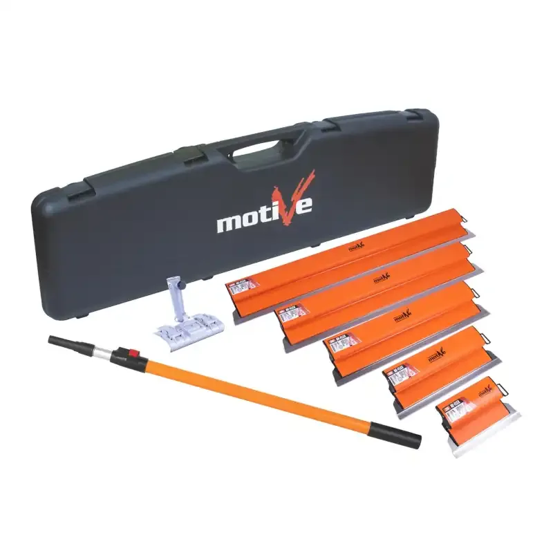 Re-Flex zestaw szpachli z walizką marki Motive – kompleksowe narzędzie do wykonywania gładzi. Zestaw zawiera szpachle o różnych rozmiarach, kij teleskopowy, adapter oraz praktyczną walizkę.
