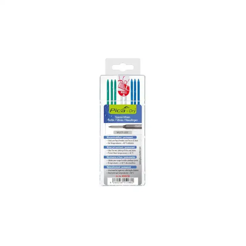 Specjalistyczne wkłady grafitowe Pica Dry na mokro zostały stworzone z myślą o precyzyjnym oznaczaniu na powierzchniach mokrych, takich jak kamień czy płytki ceramiczne. Dzięki wodoodpornej konstrukcji i wysokiej trwałości, doskonale sprawdzają się w wymagających warunkach pracy. Fabrycznie zaostrzone i wolne od chlorków, oferują niezrównaną jakość i precyzję znakowania.