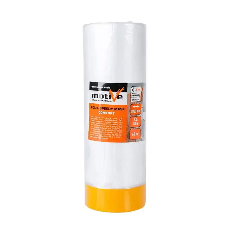 Folia Speedy Mask 3000mm/20m – folia ochronna z pomarańczową taśmą Washi (30 mm). Idealna do zabezpieczania powierzchni gładkich i lekko chropowatych podczas prac remontowych. Pokrywa do 60 m².