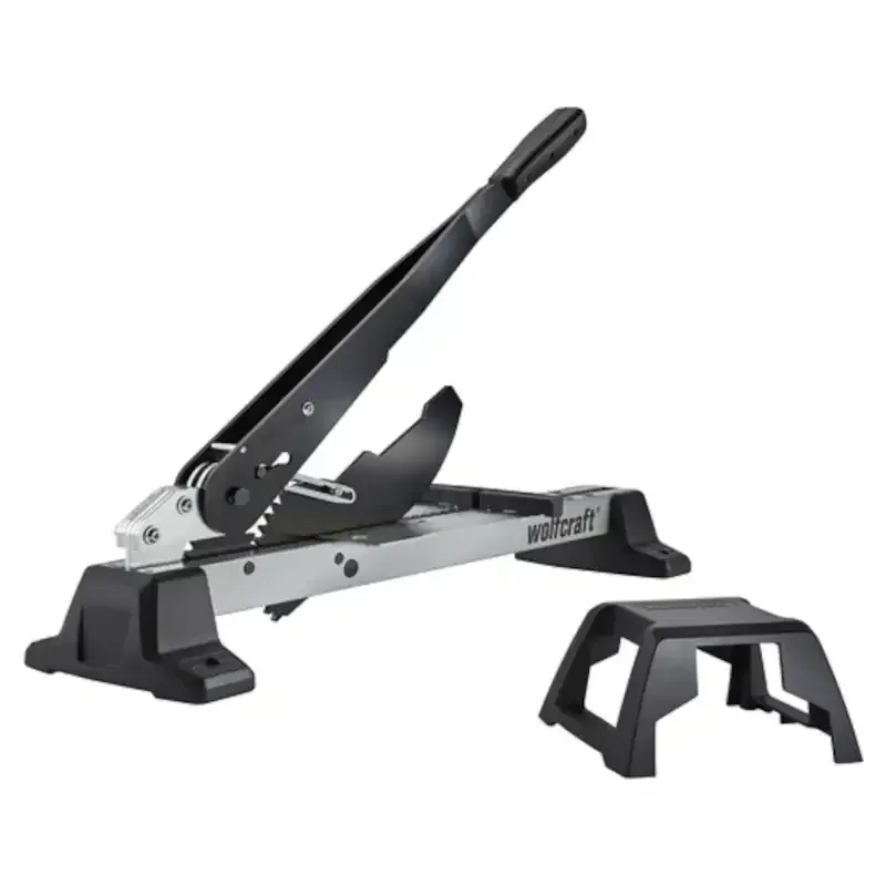 Mocna, profesjonalna gilotyna VLC 1000 do cięcia paneli laminowanych, winylowych i ozdobnych o grubości do 14 mm i szerokości 370 mm. Wyposażona w przekładnię zębatą z 3-krotnym przełożeniem siły, mechanizm powrotny ostrza oraz regulowaną szczelinę cięcia. Idealna do cichej, bezpyłowej pracy.